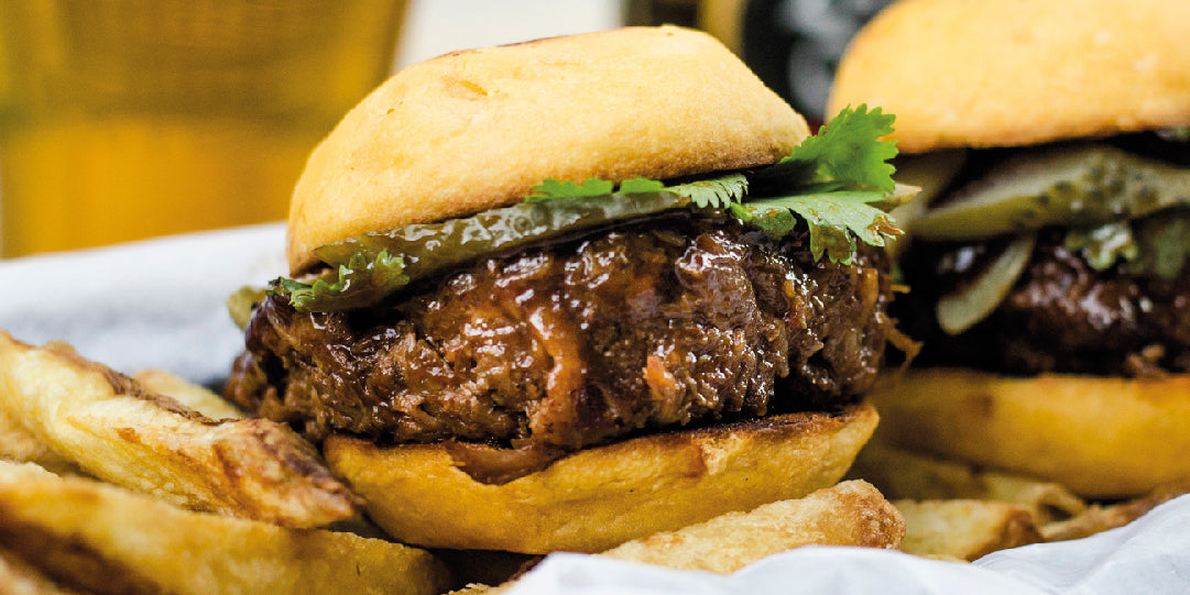 Doble medallón “PLANT BASED” a base de proteína de arvejas, doble queso cheddar, pepinos agridulces, cebolla morada, mostaza y ketchup Heinz