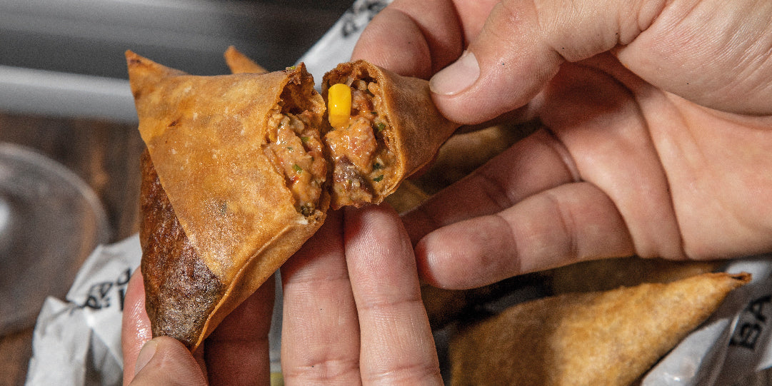 Triángulos rellenos de pollo, alubias, tomate, maíz, jalapeño y cheddar, con salsa de palta y queso finlandia