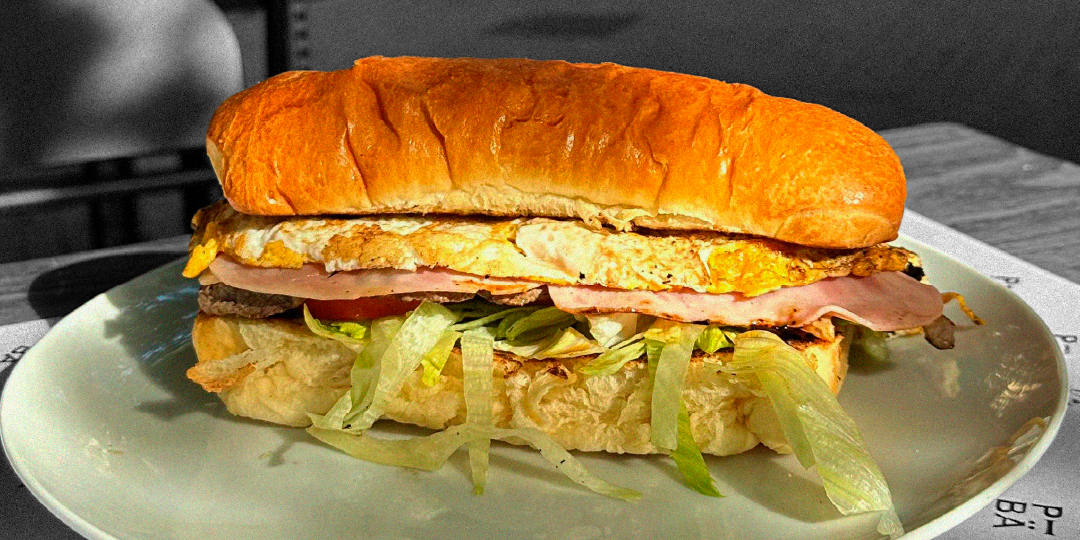 Combinaison copieuse de pain brioché, de viande, de jambon doux, de fromage, d'œuf grillé, de tomate, de laitue et de sauce mayonnaise secrète