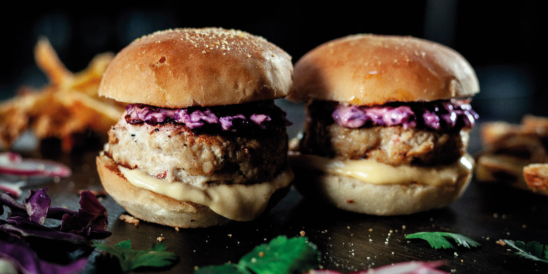 Hambúrguer de frango e bacon, salada de repolho roxo e maionese, molho Dijon e raiz-forte. SPICY!