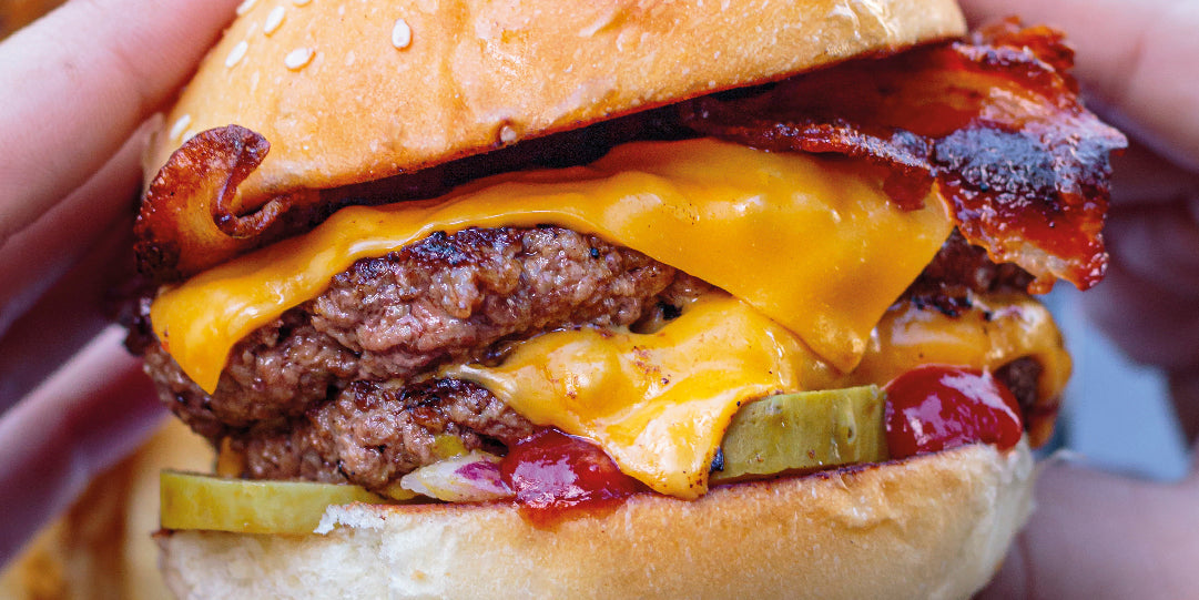 Carne bovina duplamente amassada, queijo cheddar duplo, bacon, picles agridoces, cebola roxa, ketchup e mostarda Heinz, em pão de batata